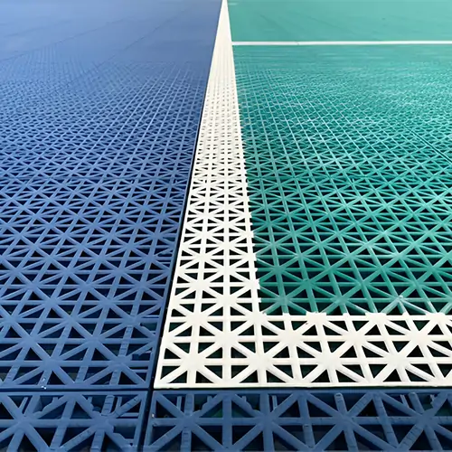 ✅ Material Specification Material Type: High-impact polypropylene copolymer Tile Size: 250 mm × 250 mm / 300 mm × 300 mm Tile Thickness: 12 mm – 15 mm System Type: Modular interlocking sports tiles ✅ Technical Performance Shock Absorption: 30% – 40% Load Capacity: High impact resistance Surface Texture: Anti-skid & anti-glare finish Drainage: Open grid drainage system UV Resistance: Excellent Durability: 10 – 15 years ✅ Installation Details Installed on leveled concrete surface Snap-lock interlocking system Expansion gap provision ✅ Key Features ✔ Quick installation ✔ Portable & easy repair ✔ Excellent drainage ✔ Suitable for multi-sport courts